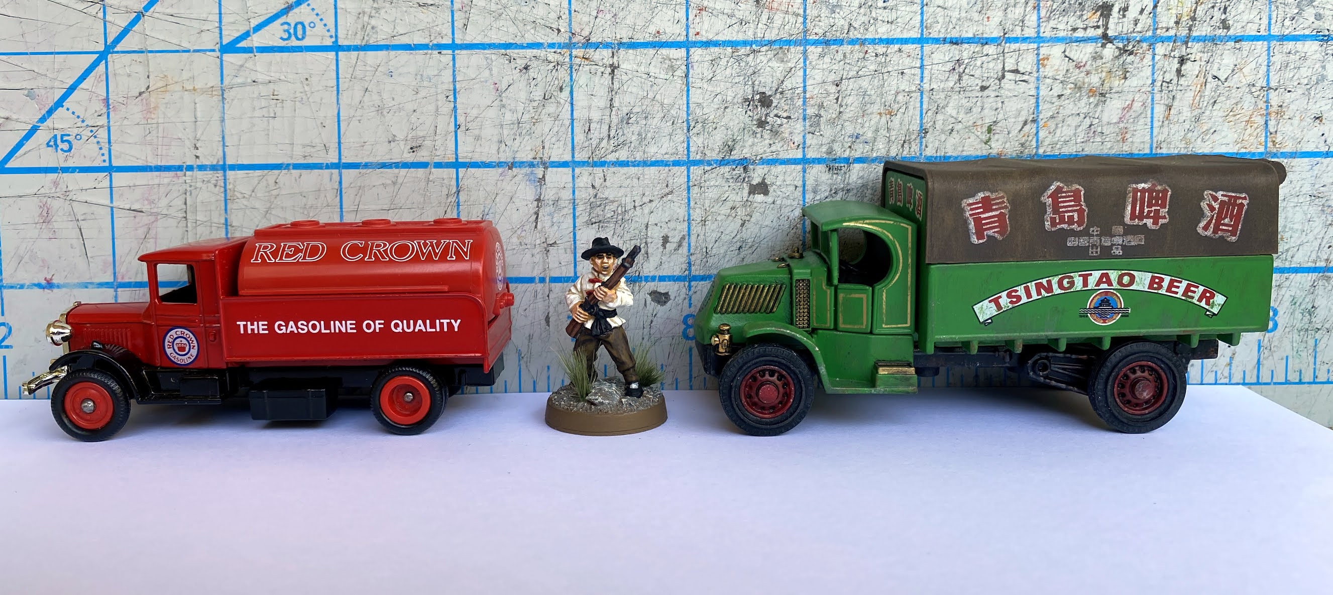 I have not be able to find a scale guide for the various Lledo vehicles, But I think these models looked reasonable with a Copplestone Chinese figure and against a Warlord Games 1/56 Morris 15cwt Truck.